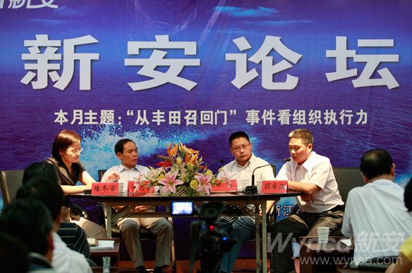 7月25日,第二期新安論壇在九樓會議室如期開講,本期論壇的主題為“從‘豐田召回門’事件看組織執行力”,洪志標、葉飛、顧卓江、吳啟壽、方晗、胡志紅6嘉賓在主持人陸冬云的引導串接中,從各自的工作角度出發,圍繞如何在公司內提升組織執行力這一內容發表觀點。公司領導王偉、潘秋友、林加善、任不凡、姜永平、周家海、包雪傳和70余名公司中層干部現場聽取嘉賓觀點。